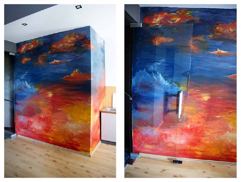 Zajmujemy się też artystycznym malowaniem ścian na życzenie i potrzeby klienta. Malujemy proste wzory tworzone "od szablonu", bez światłocienia, geometryczne kształty, płaskie obrazy jak również wykonujemy obrazy, gdzie kolory przenikają się, mieszają i tworzą wspólną całość.
